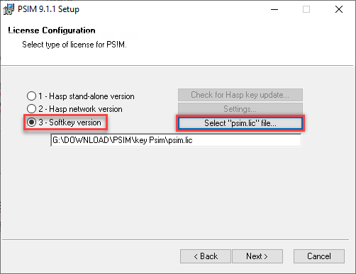 Bước 5: Ở bước này một cửa sổ hiện ra, bạn chọn Softkey version, nhấn vào Slect “psim.lic” file và tìmđường dẫn đến file psim.lic trong thư mục key Psim. Bạn tiếp tục nhấp Next.