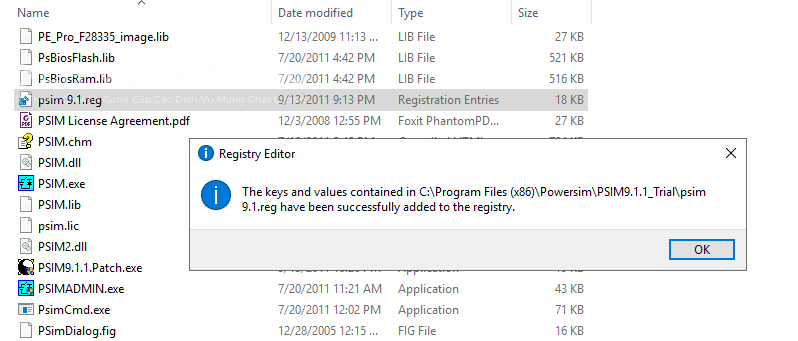 Bước 9: Bạn vào thư mục key psim copy hai file psim9.1.reg và PSIM9.1.1.Patch.exevào thư mục cài đặt của Psim ở ổ cài đặt (có đường dẫn C:\Program Files (x86)\Powersim\PSIM9.1.1_Trial)